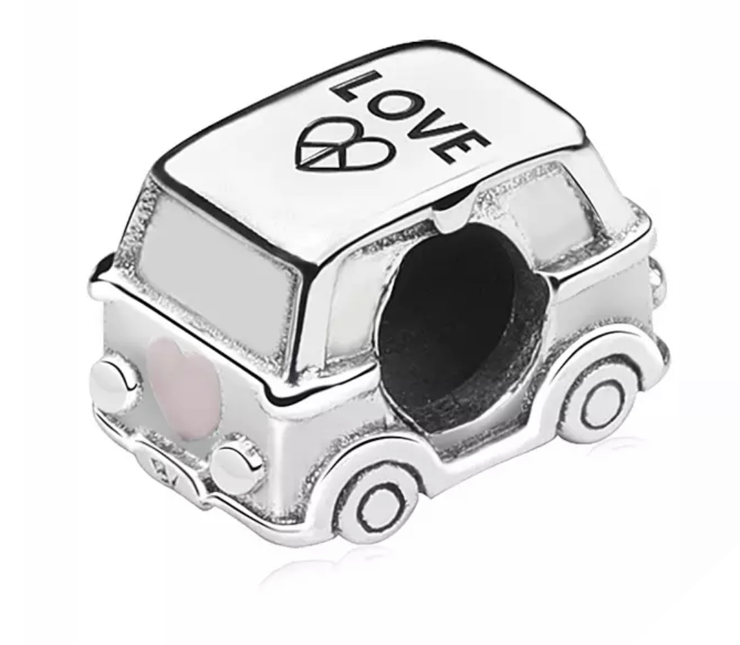 Het verschil is de bevestiging aan je bedelarmband. Een bedel (ook Bead) heeft een opening in het centrum. Je bedelarmband gaat daar direct doorheen. Een charm (ook Hanger of Dangle charm) heeft een oogje. Het sieraad hangt dus aan het oogje aan je armband. Deze bedel camper bus is dus een ‘bead’.