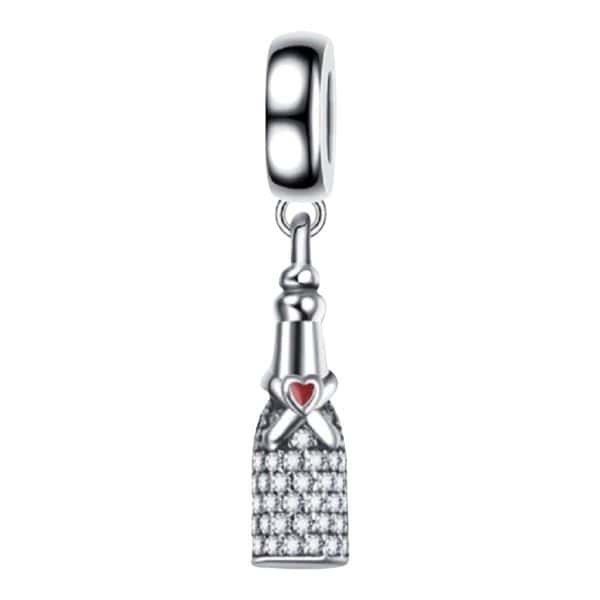 Het verschil zit in de manier van bevestigen aan je bedelarmband. Een bedel (of Bead) heeft een opening in het centrum. De armband gaat dus direct door de bedel heen. Een Charm (ook wel Dangle Charm) heeft een oog. Het sieraad hangt dus aan het oogje aan je armband. Deze bedel champagnefles is dus een ‘charm’.