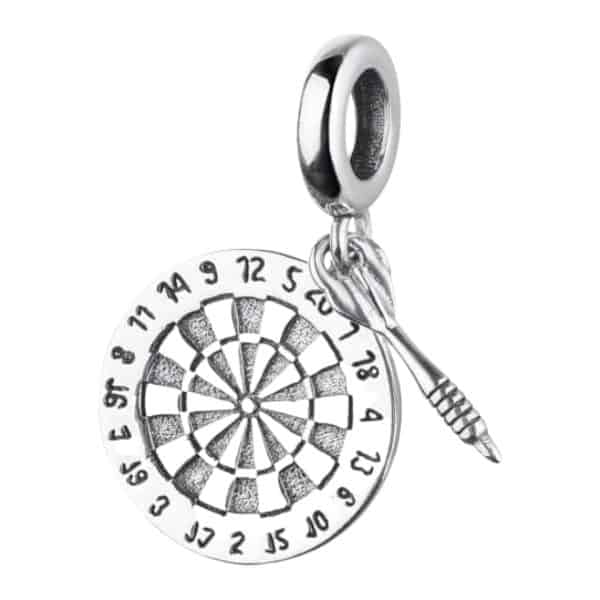 Het verschil is de manier waarop het sieraad aan je armband wordt bevestigd. Een bedel (of Bead) heeft een opening in het centrum. De armband gaat rechtstreeks door de bedel heen. Een Charm (ook wel Hanger) hangt aan het oogje aan je bedelarmband. Deze bedel darten is dus een ‘charm’.