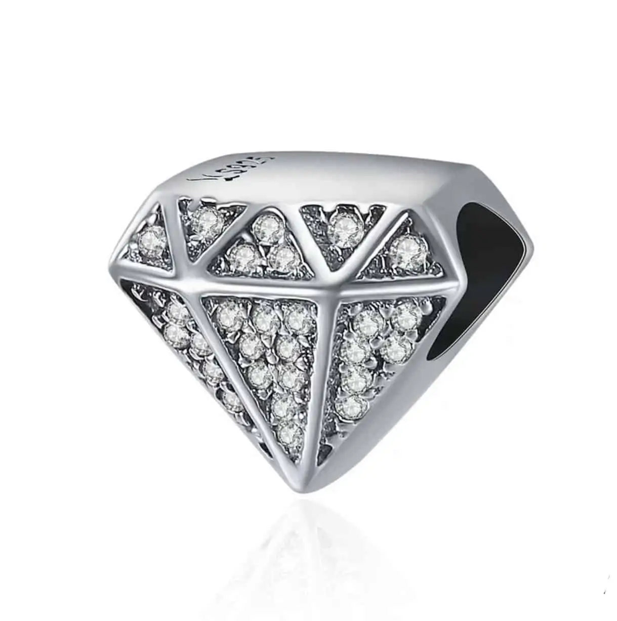 Het verschil zit in de manier van bevestigen aan je bedelarmband. Een bedel (of Bead) heeft een opening in het centrum. De armband gaat dus direct door de bedel heen. Een Charm (ook wel Dangle Charm) heeft een oog. Het sieraad hangt dus aan het oogje aan je armband. Deze bedel diamant is dus een ‘bead’.