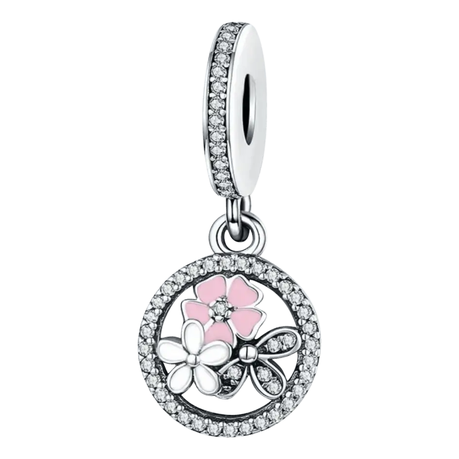 Zilveren bedel madeliefjes met 925 certificaat. Geweldig bedeltje met drie madeliefjes in zilver, wit en roze. Dangle charm madelief met zirkonia rondom de hanger. De leukste zilveren bedels en charms shop je vertrouwd. Met de zekerheid van een 925 Zilver echtheidscertificaat en altijd verpakt in een mooie cadeau verpakking. Je profiteert altijd van gratis verzending en retour in België en Nederland. We voegen elke week nieuwe modellen toe aan de collectie. Kijk ook eens naar de leuke draaiende bedel madeliefje.