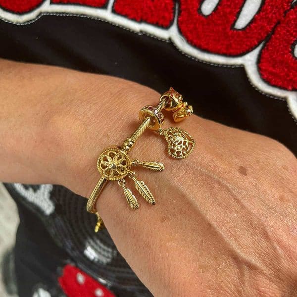 Zilveren bedel dromenvanger gold met 925 zilver certificaat. Pandora geschikt. De mooiste bedel om goed te slapen én te dromen met veren. Droom weg bij de symboliek van de Indianen. Leuke zilveren bedels en charms shop je vertrouwd. Met de zekerheid van een 925 Zilver echtheidscertificaat. En mooi verpakt in cadeauverpakking. We hebben deze geweldige bedel ook als bedel dromenvanger zilver en dromenvanger rosé. We presenteren wekelijks nieuwe ontwerpen. Bovendien profiteer je van gratis verzending en retour. Kijk ook eens naar de inspirerende bedel dromenvanger mét levensboom. En check deze prachtige oorbellen dromenvanger.