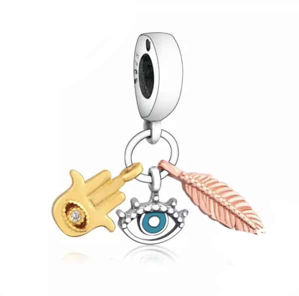 Zilveren bedel Hamsa hand met 925 certificaat en Pandora geschikt. Met veer, het boze oog en de hand van Fatima. Driedelige charm bedel in tri-color massief zilver. Met dit bedeltje voeg je bescherming én geluk toe aan je bedelarmband. Met de geluksveer en het Boze Oog ben je optimaal beschermd. De mooiste zilveren bedels en charms shop je vertrouwd. Met de zekerheid van een 925 zilver echtheidscertificaat en mooi verpakt in cadeauverpakking.