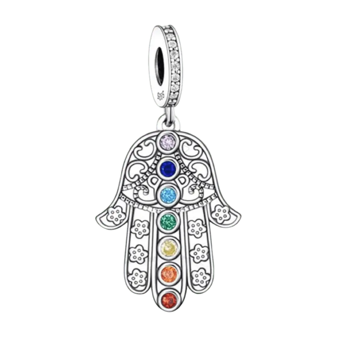 Zilveren Hamsa hand bedel met 925 certificaat. Pandora geschikt en opvallend bezet met gekleurde zirkonia steentjes. Mystieke bedel in hangend charm model, ook wel bekend als de Hand van Fatima. Met deze zilveren bedel draag je geluk én bescherming aan je armband. De mooiste zilveren bedels en charms shop je vertrouwd. Met de zekerheid van een 925 Zilver echtheidscertificaat en leuk verpakt in geschenk verpakking.