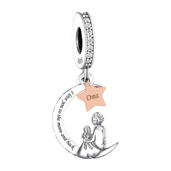 Bedel Oma met Zilver certificaat en Pandora compatible. Onze bedel Oma is nieuw in de collectie Familie bedels. รlke oma is speciaal en daarom hebben we deze liefdevolle maan en ster bedel voor jouw allerliefste grootmoeder. Of je draagt โm zelf om te laten zien hoe speciaal jouw oma voor je is. Geweldige bedel oma en kleinkind in twee kleuren zilver. Love you to the moon and back! De allermooiste zilveren bedels en charms shop je betrouwbaar รฉn betaalbaar. Met de zekerheid van een 925 Zilver echtheidscertificaat. Direct uit voorraad geleverd. En altijd feestelijk verpakt in cadeauverpakking.