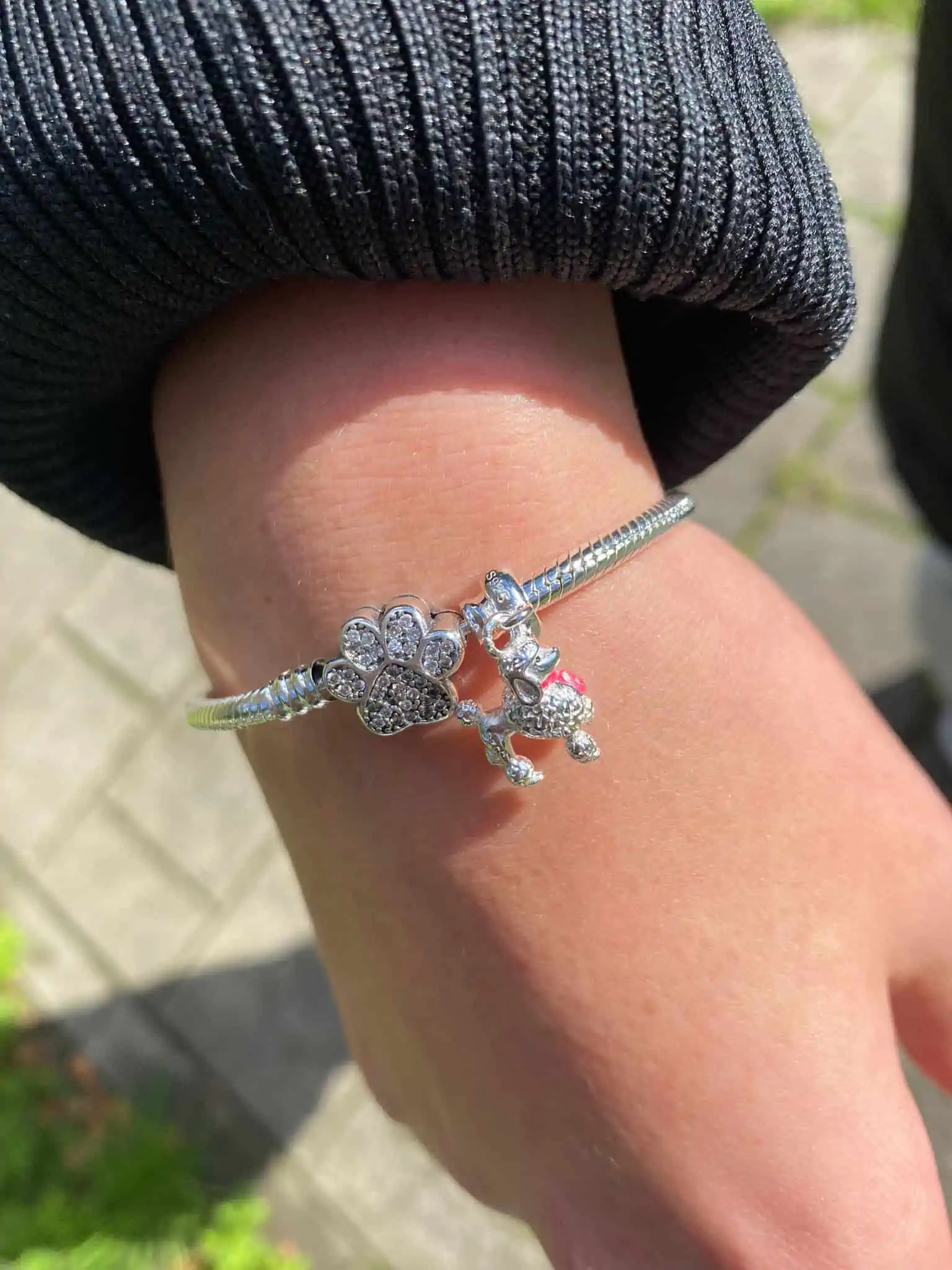 Het verschil zit in de manier van bevestigen aan je armband. Een Bedel (ook wel Bead) heeft een opening in het midden. Je bedelarmband gaat direct door de bedel heen en de bedel is dus rechtstreeks aan je armband verbonden. Een Charm (of Hanger) heeft een oogje. Het sieraad hangt dus aan het oog aan je bedelarmband. Deze bedel poedel is dus een ‘charm’.