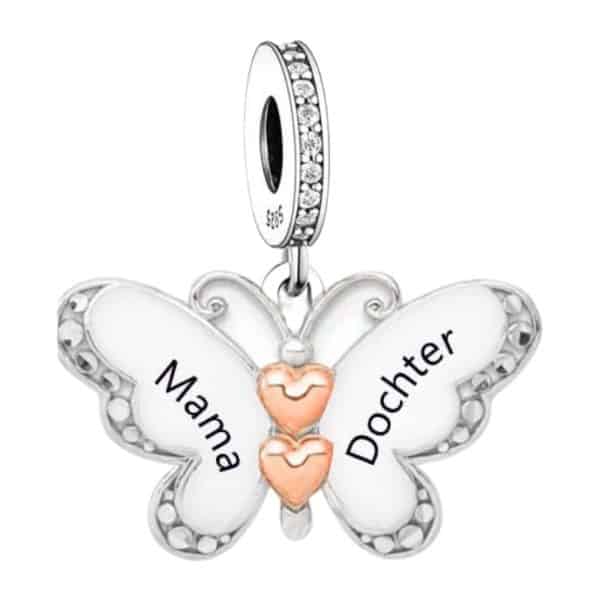 Zilveren vlinder bedel mama en dochter met 925 certificaat. Pandora compatible en uitgevoerd met accenten in rosรฉ zilver en zirkonia. Deze nieuwe vlinder familie serie is nu al een van onze meest populaire collecties. Superlieve bedel voor moeders en dochters. De mooiste zilveren bedels en charms shop je vertrouwd. Met de zekerheid van een 925 Zilver echtheidscertificaat en verpakt in een leuke cadeau verpakking. Je profiteert van gratis verzending en retour in Belgiรซ en Nederland. In deze serie hebben we ook vlinder bedel vader en dochter en oma en kleindochter. Check ook onze complete collectie vlinder sieraden.