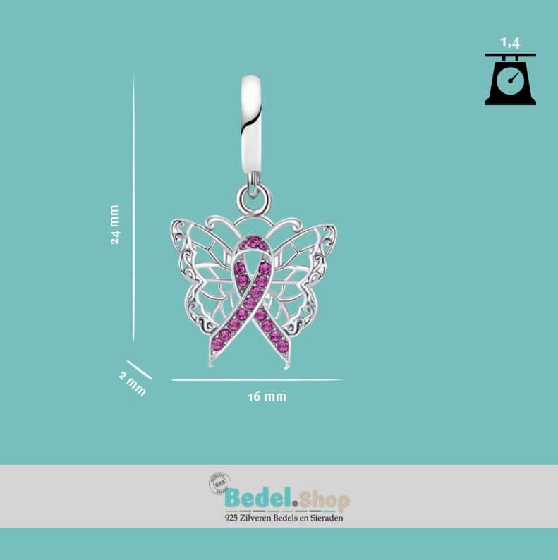Prachtige zilveren bedel pink ribbon bedel met vlinder. Pandora geschikt en geleverd inclusief 925 zilver certificaat. Deze fraaie vlinder bedel biedt ondersteuning en zorgt voor een bijzonder accent aan jouw bedelarmbandje. De mooiste zilveren bedels en charms shop je vertrouwd. Met de zekerheid van een 925 Zilver echtheidscertificaat en leuk verpakt in geschenkverpakking. We presenteren elke week nieuwe bedels en sieraden. Je profiteert verder van gratis verzending en retour. Check ook de geweldige pink ribbon bokshandschoen ‘Fight’ en de mooie pink ribbon slipper bedel ‘never walk alone’.