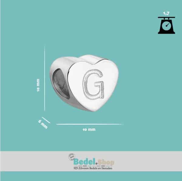 • Product Afbeelding Voor en Achteraanzicht van onze prachtige hart letter bead uit de collectie sierletters en cijfers. Deze prachtige bedel met de letter G is gemaakt van 925 sterling zilver en is gegraveerd met de letter g in het hart.