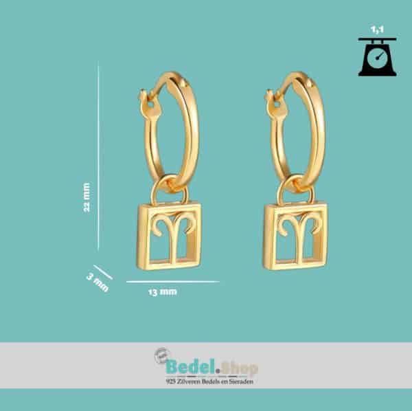 Zilveren sterrenbeeld oorbellen Ram mét 925 certificaat. Pandora geschikt en uitgevoerd in goudkleurig zilver. Jij wordt blij van deze oorbellen zeker als jouw horoscoop Ram is. Oorringen zijn bovendien een ideaal cadeau voor iemand waar je om geeft. Want ze passen altijd! De ringen hebben een subtiele doorsnede van 12 mm en de totale lengte van de oorbel is 23 mm. We verpakken daarom al onze sieraden in een leuke geschenkverpakking. Liever een bedel met je sterrenbeeld? Kijk eens naar de schitterende symbool bedel horoscoop ram met zirkonia?