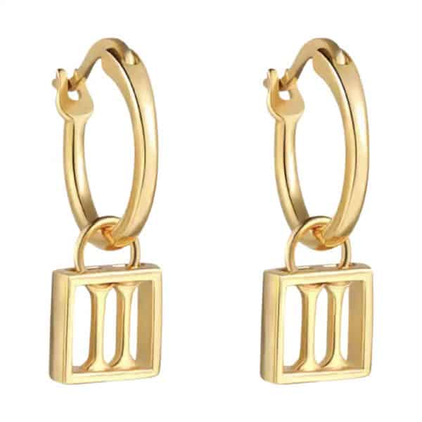 • Product Afbeelding Vooraanzicht van onze nieuwe oorbellen uit de horoscoop collectie. Deze prachtige oorringen met het horoscoopteken tweeling zijn een echte eyecatcher aan je oren. Deze oorbelletjes zijn gemaakt van 925 sterling zilver met een laagje 18 karaat goud.
