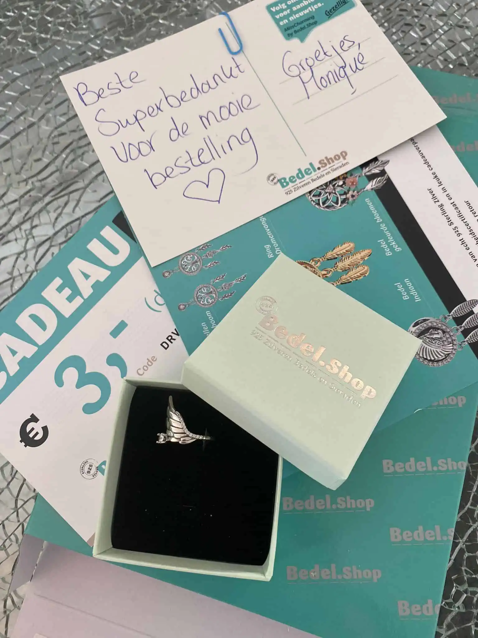 Een ring met engel vleugel is natuurlijk een geweldig cadeau. We verpakken daarom elke ring in een leuke geschenk verpakking. Tof om te krijgen én te geven. We maken graag een klein feestje van jouw nieuwe zilveren ring.