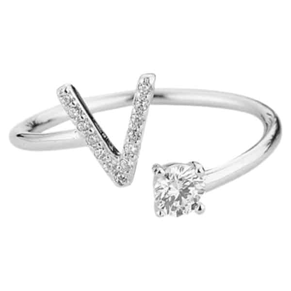 Exclusieve zilveren letter ring V inclusief 925 certificaat. Jouw initialen ring is bezet met een centrale glinsterende zirkonia steen en kleine zirkonia steentjes rondom. De ring is verstelbaar door voorzichtig te buigen. Een initialen ring biedt volop mogelijkheden om te combineren. Je vindt in onze collectie prachtige zilveren ringen met initiaal van het complete alfabet van A tot Z.