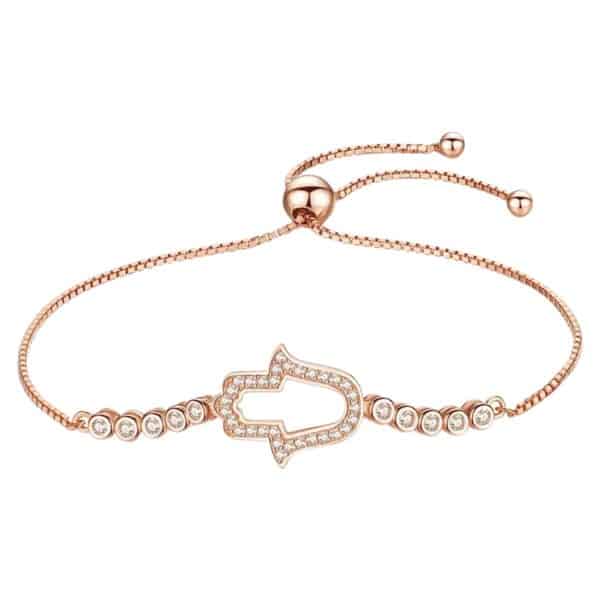 Zilveren armband Hamsa hand rosé met 925 certificaat. Prachtige sliding armband met de Hand van Fatima voor bescherming en geluk. Met jouw Hamsa hand armbandje draag je het geluk letterlijk aan je zijde. Van massief rosé kleurig 925 Zilver met flonkerende zirkonia steentjes. Al onze sieraden worden geleverd met een 925 Zilver certificaat van echtheid. Dus jij hebt zekerheid over de waarde van je aanschaf. Verzending en retour is gratis in NL en BE.