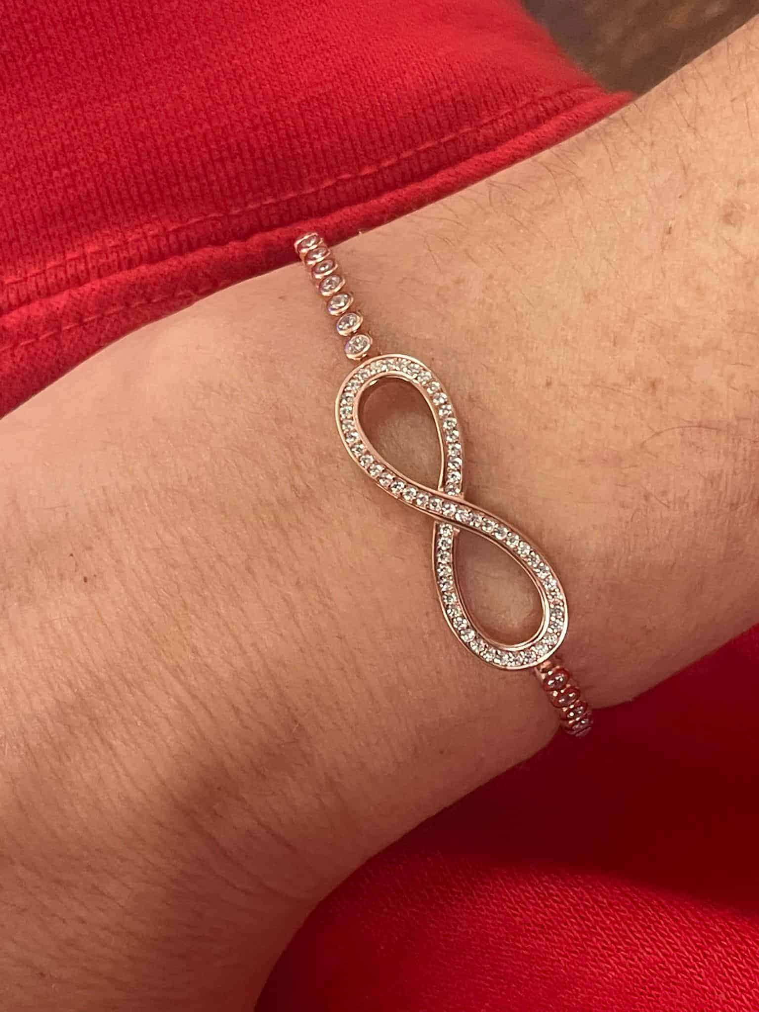 Zilveren sliding armband infinity XL met 925 certificaat. Uitgevoerd in chique rosé zilver en rijk bezet met flonkerende zirkonia. Deze fantastische sliding armband infinity is verstelbaar van doorsnede 15 tot 24 cm. We hebben veel bedelarmbanden in de collectie. Maar we hebben dus ook armbanden die niet bedoeld zijn voor bedels en charms. Zoals dit prachtige model met sliding sluiting. We leveren al onze sieraden inclusief 925 Zilver echtheidscertificaat. Jij hebt daardoor zekerheid over de echtheid van je aankoop. Je profiteert van gratis verzending en retour. En we verpakken je bestelling feestelijk in een leuke geschenkverpakking. We voegen wekelijks nieuwe verrassende sieraden aan de collectie toe. Combineer deze armband met rosé zilveren zeester oorbellen of een rosé zilveren ring met sprankelende zirkonia.
